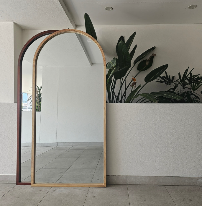 Introducing our Coastal Arch Mirror. From a wooden breezy frame, this mirror features a grand arch design that combines timeless charm with modern functionality. Its rich, hand-finished stain accentuates the natural wood texture, adding warmth and character to any room. Whether placed in your bedroom, entryway, or living room, this mirror serves both practical and decorative purposes. With its versatile style and large size, it seamlessly complements various interior design aesthetics, making it a perfect addition to any home.